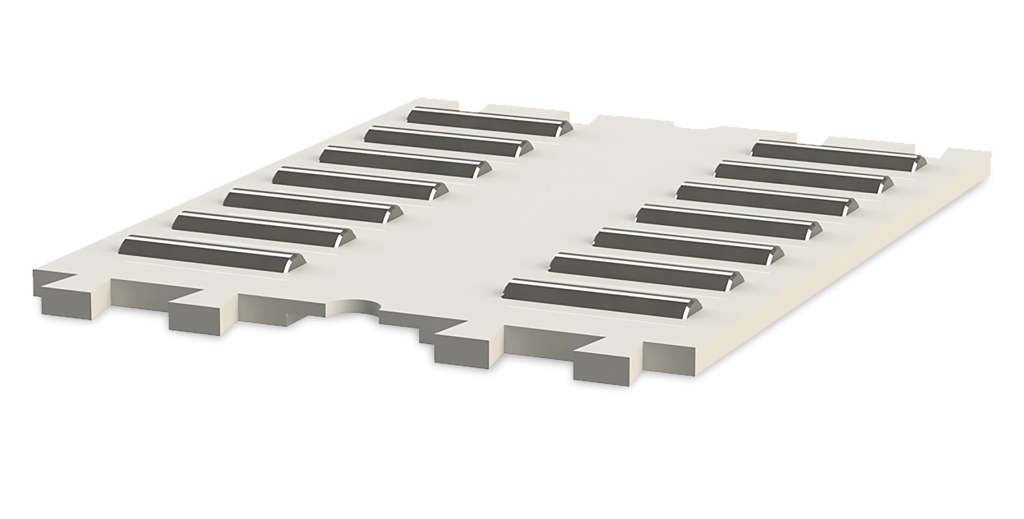 Plastic cage type FF-ZW is a single element cage with a double row of needle rollers, suitable for easy to normal operating conditions. The material of the cage is durable plastic. Greater lengths can easily be created to connect individual elements, using a “snap in” technique with dovetail grooves on both ends of the cage. The permissible operating temperature of the cage is -30 to +80 °C.