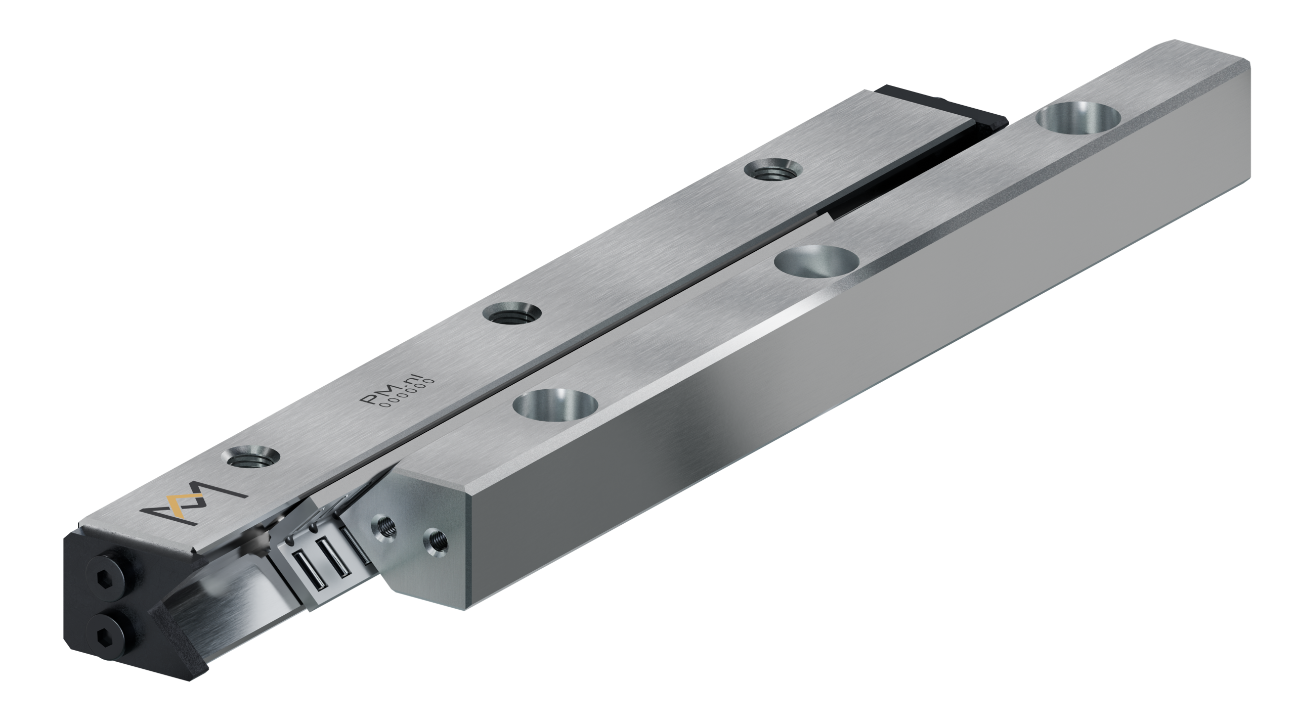 These precision linear guides consists of two matched pairs of rails (one pair is imaged), each composed of one M-type (male) and one V-type (female) rail, with a needle roller cage positioned in between and end plates in rail ends preventing the cage from running out. One set consists of 4 rails and 2 cages and end plates. Number of end plates is depending on the type.